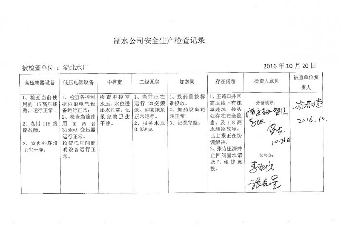 涡北水厂2016年10月安全生产检查记录