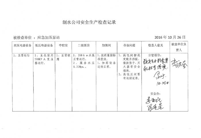 应急加压泵站2016年10月安全生产检查记录