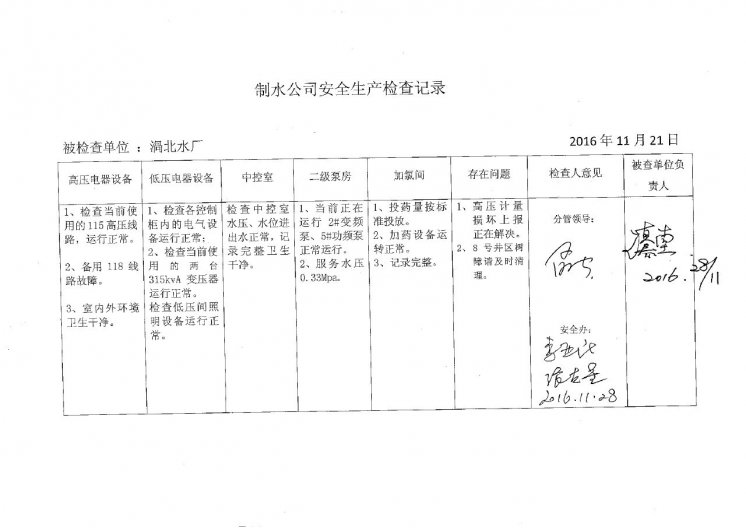 涡北水厂2016年11月安全生产检查记录