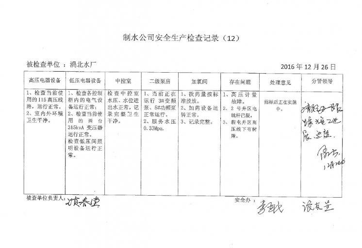 涡北水厂2016年12月安全生产检查记录