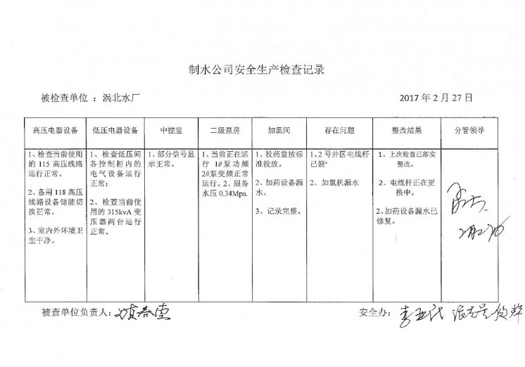 涡北水厂2017年2月安全生产检查记录