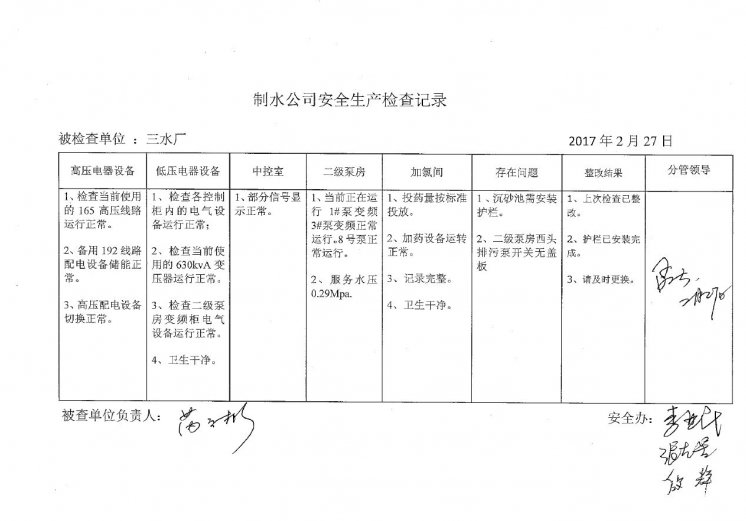 三水厂2017年2月安全生产检查记录