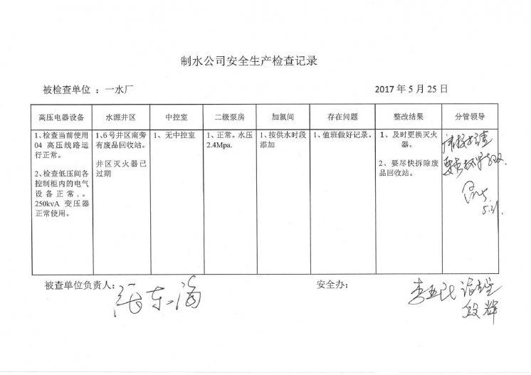 一水厂2017年5月安全生产检查记录