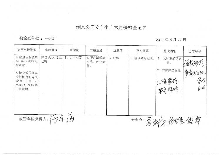 一水厂2017年6月安全生产检查记录