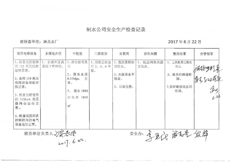 涡北水厂2017年6月安全生产检查记录