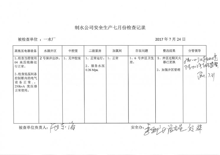 一水厂2017年7月安全生产检查记录