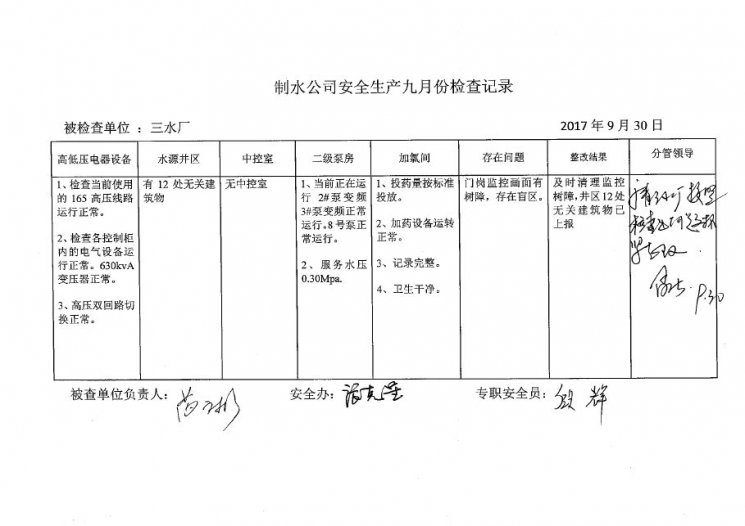 三水厂2017年9月安全生产检查记录