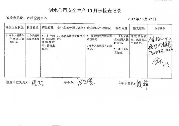 水质检测中心2017年10月安全生产检查记录
