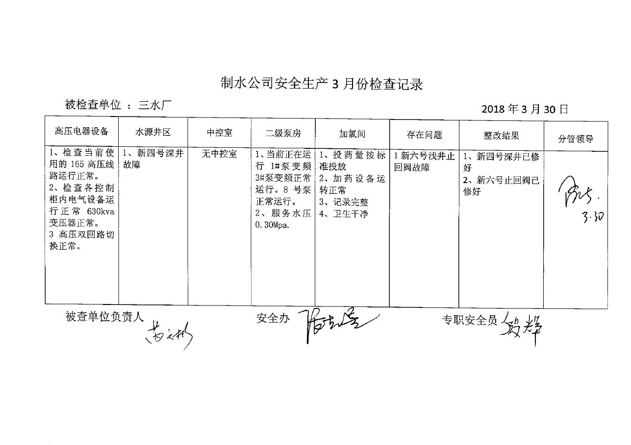 三水厂2018年3月安全生产检查记录