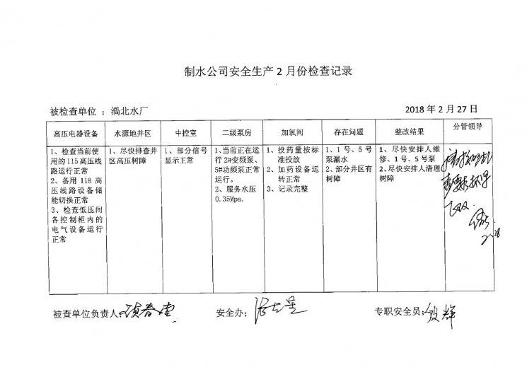 涡北水厂2018年2月安全生产检查记录