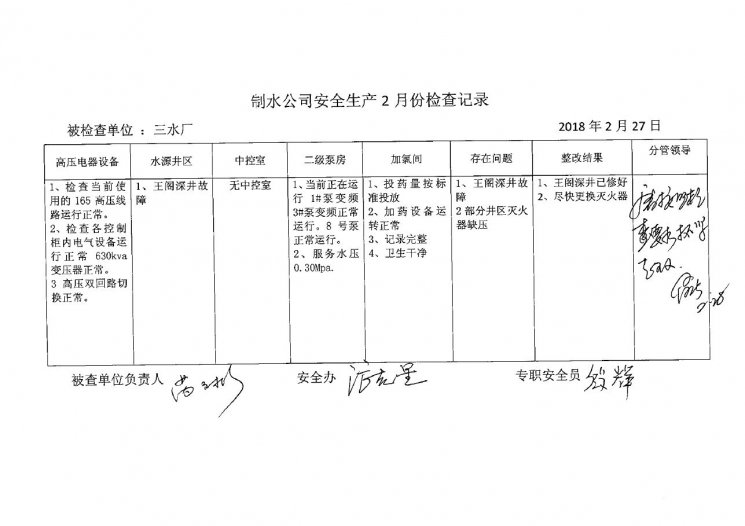 三水厂2018年2月安全生产检查记录