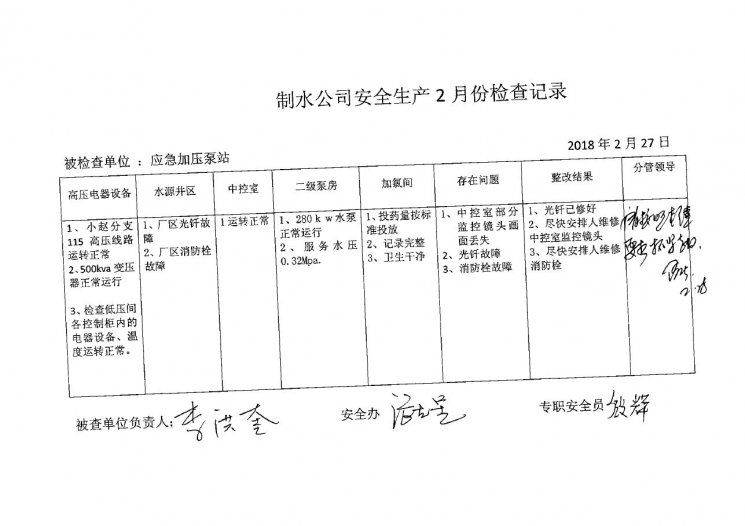 加压泵站2018年2月安全生产检查记录